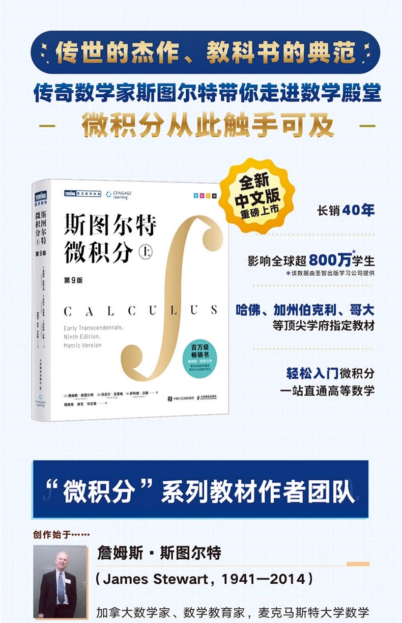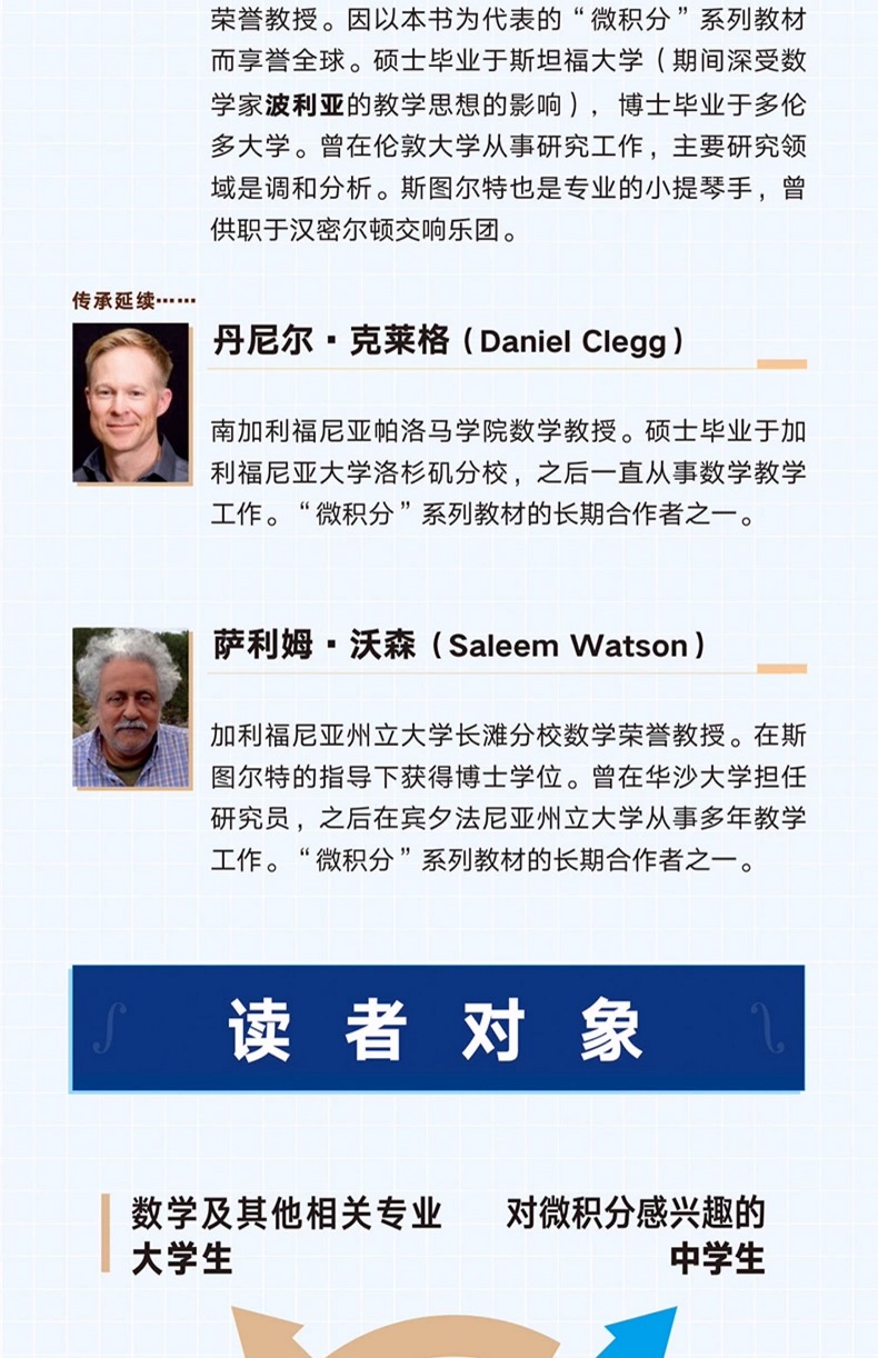 詹姆斯‧斯圖爾特(James Stewart,1941—2014),加拿大數學家、數學教育家,麥克馬斯特大學數學榮譽教授。因以本書為代表的「微積分」系列教材而享譽 。碩士畢業於史丹佛大學(期間深受數學家波利亞的教學思想的影響),博士畢業於多倫多大學。曾在倫敦大學從事研究工作,主要研究領域為調和分析。斯圖爾特也是的小提琴手,曾任職於漢密爾頓交響樂團。克萊格(Daniel Clegg),南加州帕洛馬學院數學教授。碩士畢業於加州大學洛杉磯分校,之後一直從事數學教學工作。 「微積分」系列教材的長期合作者之一。薩利姆·沃森(Saleem Watson),加州州立大學長灘分校數學榮譽教授。在斯圖爾特的指導下獲得博士學位。曾在華沙大學擔任研究員,之後在賓州州立大學從事多年教學工作。 「微積分」系列教材的長期合作者之一。