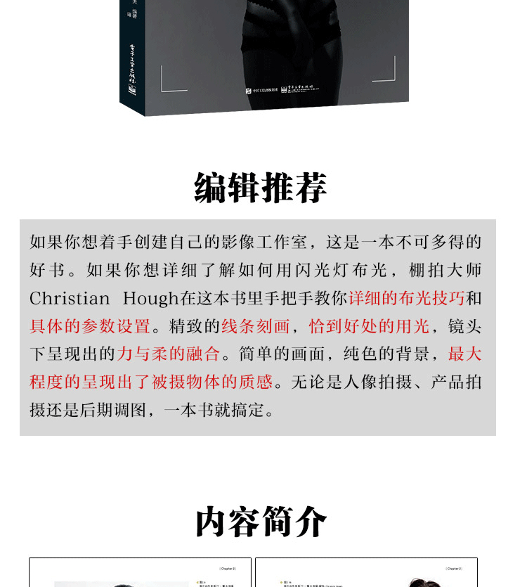 如果你想著手創建自己的影像工作室,這是一本不可多得的好書。如果你想詳細了解如何用閃光燈布光,棚拍大師Christian Hough在這本書里手把手教你詳細的布光技巧和具體的參數設置。精緻的線條刻畫,恰到好處的用光,鏡頭下呈現出的力與柔的融合。簡單的畫面,純色的背景,最大程度的呈現出了被攝物體的質感。無論是人像拍攝、產品拍攝還是後期調圖,一本書就搞定。