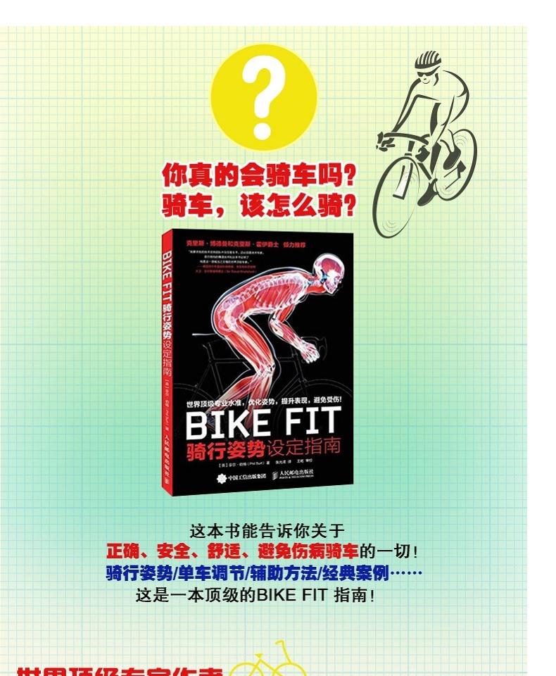 專業,作者為英國自行車國家隊的首席理療師、環法冠軍車隊英國天空車隊的自行車調節團隊負責人。他的水平是自行車醫學的專業水平,而且具有豐富的實踐經驗,因此書中內容具有很強的科學性,對於自行車運動有很好的指導作用。