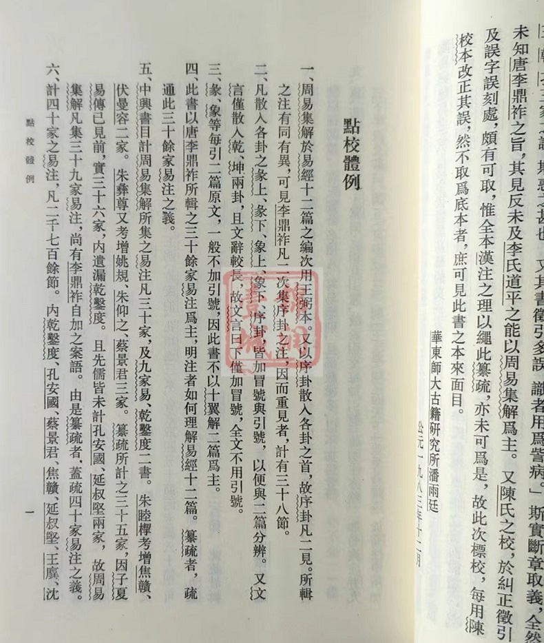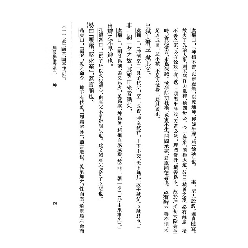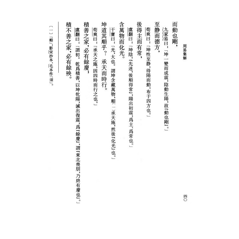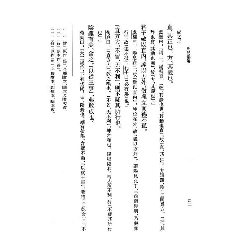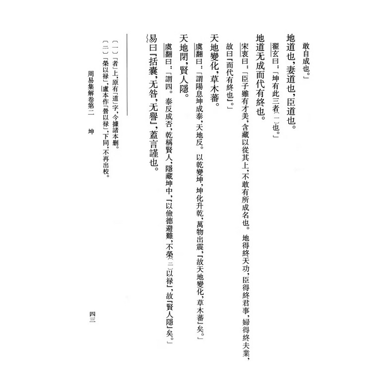 此次整理,以現存最早之足本明嘉靖三十六年朱睦?所刻聚樂堂本為底本,以汲古閣重刻《津逮秘書》本、雅雨堂本、《影印文淵閣四庫全書》本及周氏枕經樓本為校本,何楷、陸心源、惠棟、陳鱣、張惠言、阮元、孫星衍、李道平、李富孫、曹元弼等校勘名家的校勘成果,也盡可能吸收進來。基本體例是:凡底本正確,校本訛誤者不出校。常見之異體字、通假字、古今字儘量不出校。但牽涉經注一致原則,則亦出校說明。無關文意的虛詞如於乎矣焉等,概不出校。底本與校本兩通者出校。凡四種校本相同者,統稱諸本。其餘與底本相異而不誤者,逐一列出校本。