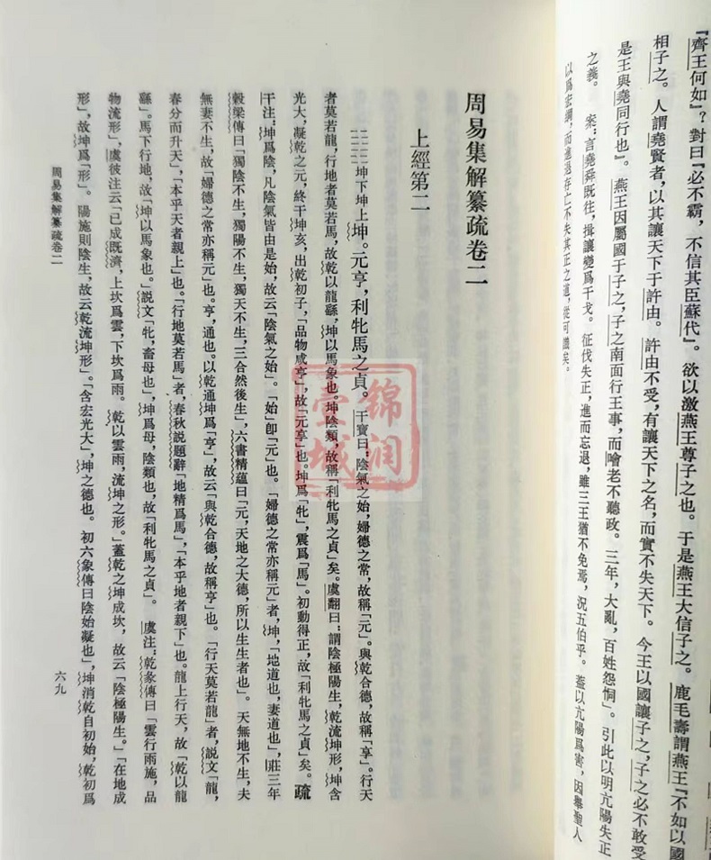 唐李鼎祚所撰《周易集解》是唐前易學研究集大成式的作品,該書收錄了子夏、孟喜、京房、馬融、荀爽、鄭康成、劉表、何晏、宋衷、虞翻、陸績、幹寶、王肅、王弼、姚信、王廙、張璠、向秀、王凱沖、侯果、蜀才、翟玄、韓康伯、劉瓛、何妥、崔憬、沈驎士、盧氏、崔覲、孔穎達等二十余家易學方面的學說,集腋成裘,雜而不越,較為客觀地呈現了唐代以前易學疏解的全景,極具學術研究價值和資料參考價值。