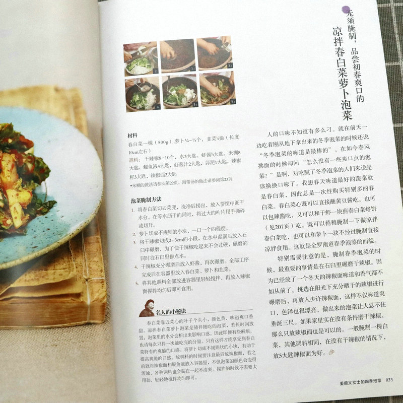 第1部分,姜順義老師通過圖文介紹,講述了適合春夏秋冬各個季節食用的泡菜做法和背後的故事,像適合春天食用的涼拌春白菜、涼拌春白菜蘿蔔泡菜、蘿蔔方塊水泡菜、石上菜泡菜,適合夏天食用的黃瓜夾餡水泡菜、洋蔥泡菜、圓白菜白泡菜等等,適合冬秋天的沙參泡菜、蓮藕泡菜等等,適合冬天食用的辣椒籽白菜泡菜、正蘿蔔泡菜等等。