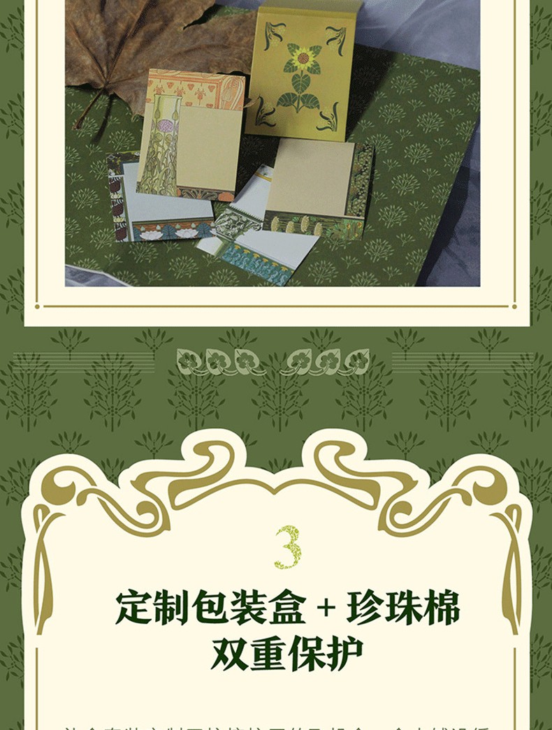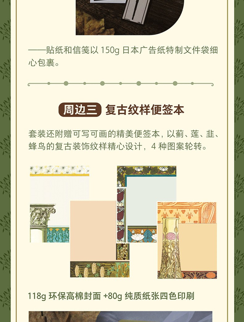 套裝還附贈可寫可畫的精美便條本,以薊、蓮、韭、蜂鳥的復古裝飾紋樣精心設計,4種圖案輪換。