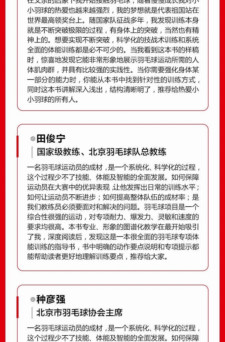 優秀的身體素質是技術水平得以良好發揮的必要支撐。 《羽毛球運動身體訓練指南》針對羽毛球運動提供了適合手臂、肩部與上背部、胸部、軀幹、臀部、腿部進行的練習動作,同時以分步驟圖解的方式講解動作要點,並配有關鍵步驟的動作解剖圖,以直觀的方式呈現訓練目標,幫助練習者有針對性地進行肌肉訓練,有效提昇運動水平。此外,《羽毛球運動身體訓練指南》針對每個訓練動作都標註了注意事項、目標鍛煉肌群,以及與羽毛球技術相結合的要點註釋,適合想不斷提高技術的羽毛球愛好者、專業運動員,以及致力於提升執教水平的教練員閱讀。