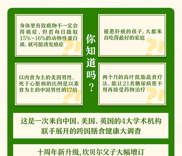 30多年前,營養學家柯林·坎貝爾教授帶領康奈爾大學的團隊,與來自中國和英國的團隊傾力合作,開始了一項針對飲食和患病風險之間關係的研究。此次調查涉及中國65個縣,調查結果契合了坎貝爾實驗室的研究結果,令他們看到了高動物蛋白飲食的危險性以及植物性飲食對健康無可比擬的好處。隨後,坎貝爾父子在這本書中向世界分享了這些發現。