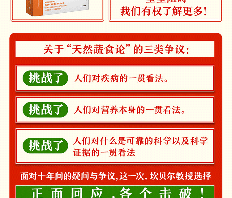 這本書是“救命飲食”三部曲的收官篇,也是作者基於數十年研究成果的全新力作,在書中,作者將人們十年來對“天然蔬食論”的爭議歸為三類: