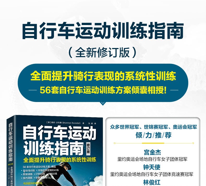 56套自行車運動訓練方案,涵蓋基礎性訓練、平地和多變地形訓練、爬坡訓練、計時訓練、衝刺訓練、室內訓練、非賽季訓練 ·專業詳解騎行技術、目標設定、訓練理念、訓練計劃制訂、恢復和損傷預防 ·有效提升肌肉力量、騎行速度和體能,全面提升騎行運動表現 中國場地自行車世界冠 軍 林俊紅 中國場地自行車全國錦標賽爭先冠 軍 包賽飛 中國場地自行車里約奧運會冠 軍 鍾天使 中國場地自行車亞洲錦標賽冠 軍 胡珂 中國場地自行車亞洲錦標賽冠 軍 徐超 聯袂推薦!