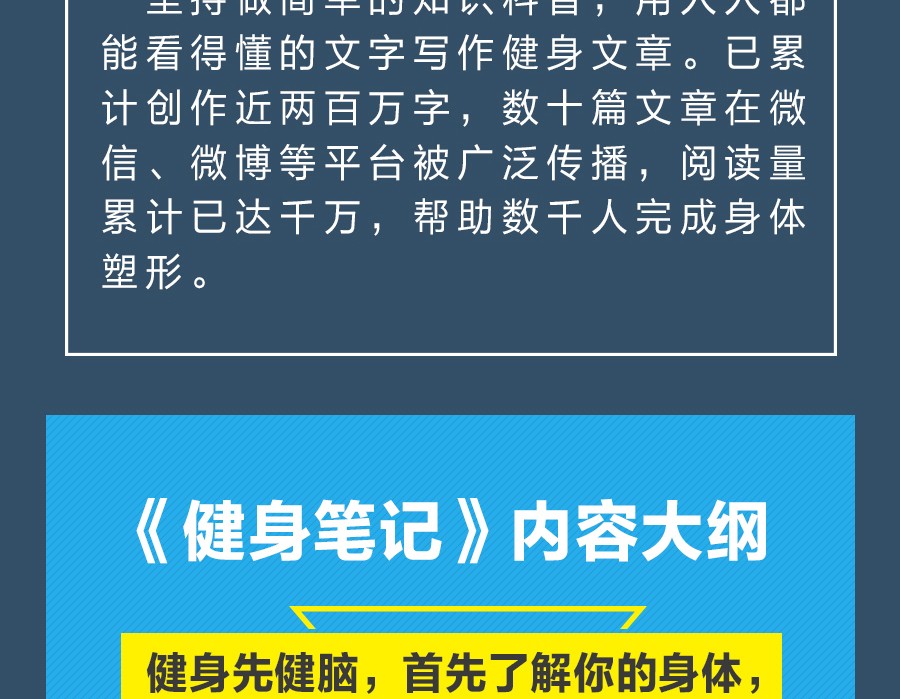 《健身筆記(如何成為一個身材有料的人)》是由知乎人氣健身科普作者叔貴寫給新手的健身入門指南。面對互聯網上大量的健身信息,剛開始健身的你是否感到迷茫――作為健身“小白”,應該如何開始鍛煉,從哪裡入手?堅持運動了很久,為什麼一直瘦不下來? “三分練,七分吃”是真的嗎?拉伸到底能不能瘦小腿……這些常常令新手感到困惑的問題,本書都給出了解答。此外,《健身筆記(如何成為一個身材有料的人)》還提供了適合新手的身體各部位的訓練動作,以及適用於家庭、健身房和辦公室的拉伸、減脂、增肌等訓練計劃,並對日常的營養策略做了詳細闡釋,教你如何根據自身的熱量需求安排健康的一日三餐。