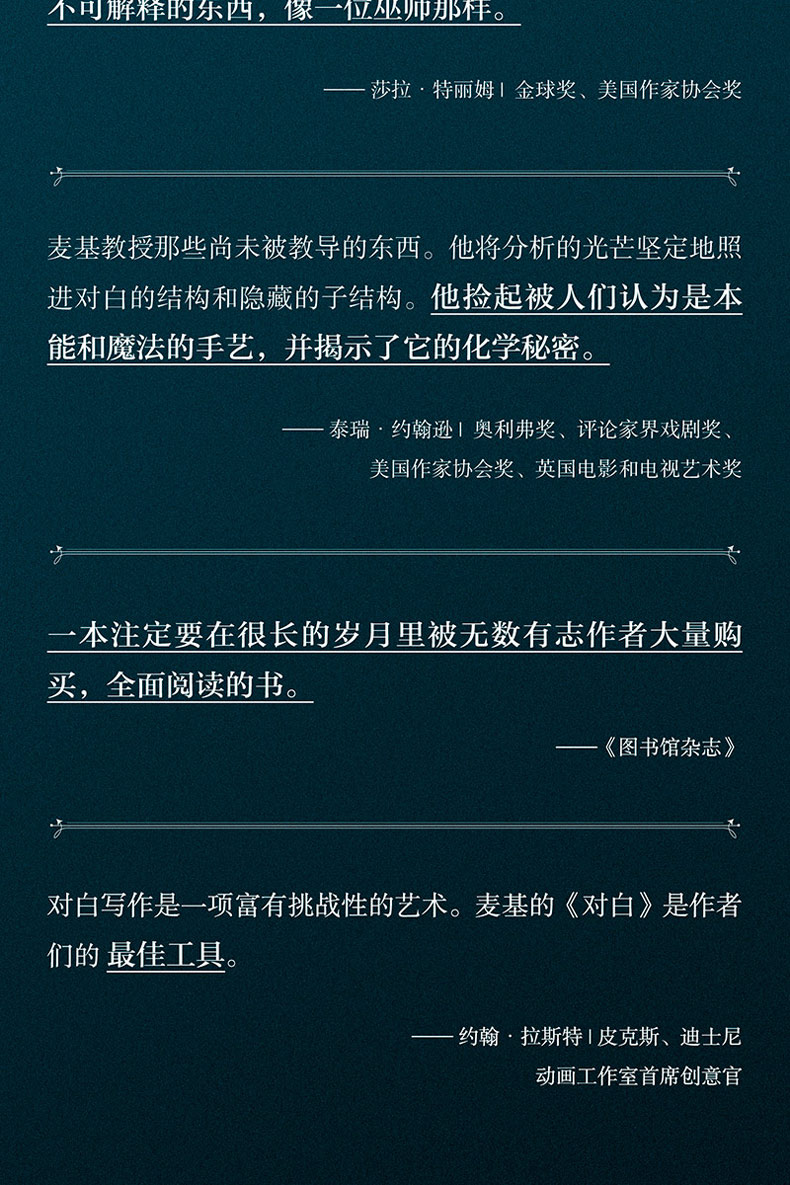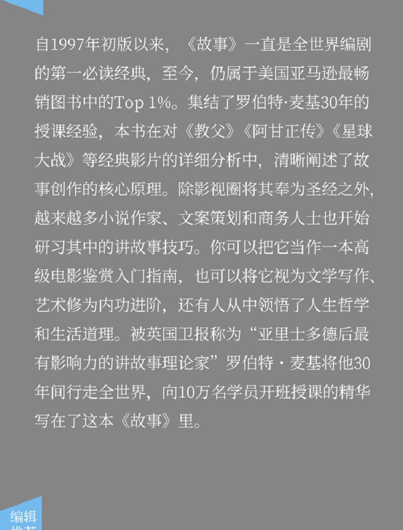 自1997年初版以來,《故事》一直是全世界編劇的必讀經典,至今,仍屬於美國亞馬遜最暢銷圖書中的Top1%。集結了羅伯特·麥基30年的授課經驗,本書在對《教父》《阿甘正傳》《星球大戰》等經典影片的詳細分析中,清晰闡述了故事創作的核心原理,其指導意義不應只被影視圈的人所認識,更應得到小說創作、廣告策劃、文案撰寫人才的充分開發。