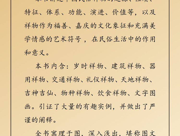 本書內含:歲時祥物、建築祥物、器用祥物、交通祥物、禮儀祥物、天地祥物、吉神吉仙、物種祥物、飲食祥物、文字圖畫。引證了大量的有趣實例,並做出了嚴謹的闡釋。