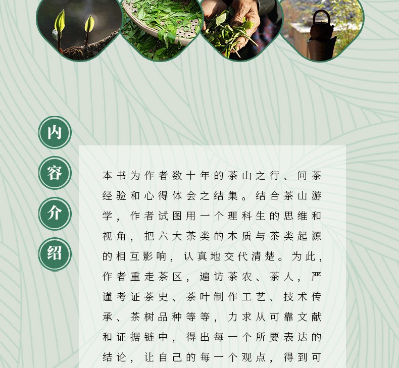 本書為作者數十年的茶山之行、問茶經驗和心得體會的集結之作。作者試圖結合茶山遊學,用一個理科生的思維和視角,把六大茶類的本質、與茶類起源的相互影響,認真地交代清楚。為此,作者重走茶區,遍訪茶農、茶人,嚴謹考證茶史、茶葉製作工藝、技術傳承、茶樹品種等等,力求從可靠文獻和證據鏈中,得出每一個所要表達的結論。讓自己的每一個觀點,得到可靠的技術與正確的理論支持。盡可能地讓每一張圖片與文字對應,可賞可讀,以圖釋文。