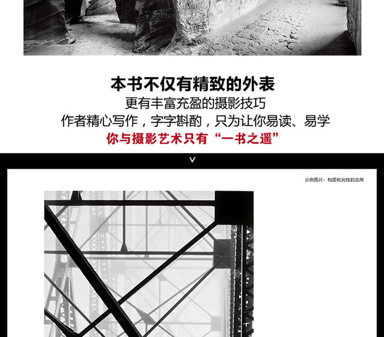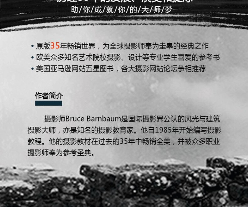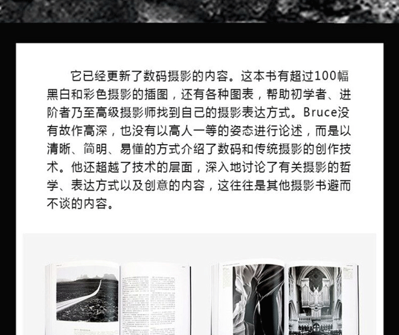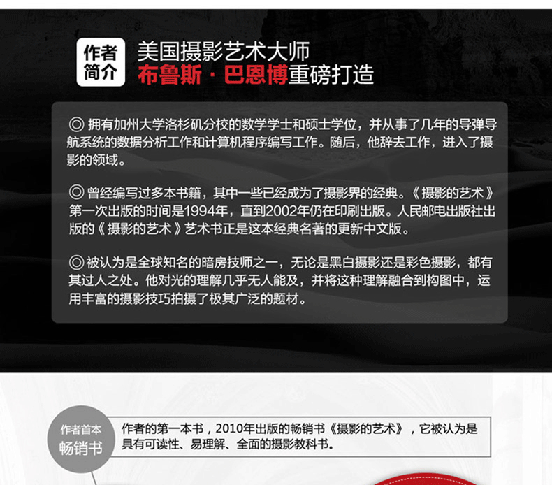 Bruce Barnbaum的經典之作《攝影的藝術(修訂版)》被譽為與美國紐約攝影學院攝影教材齊名的攝影教程。其英文原版著作於1994年出版,這部著作被認為是*具可讀性、*易理解和*為全面的攝影教科書。目前中文版已經更新了數碼攝影的內容。這本書有**過100幅黑白和彩色攝影的插圖,還有各種圖表,可以幫助初學者、進階者乃至**攝影師找到自己的攝影表達方式。 Bruce沒有故作高深,也沒有以高人一等的姿態進行論述,而是以清晰、簡明、易懂的方式介紹了數碼和傳統攝影的創作技術。他還**越了技術層面,深入地討論了有關攝影的哲學、表達方式以及創意的內容,這往往是其他攝影書避而不談的內容。