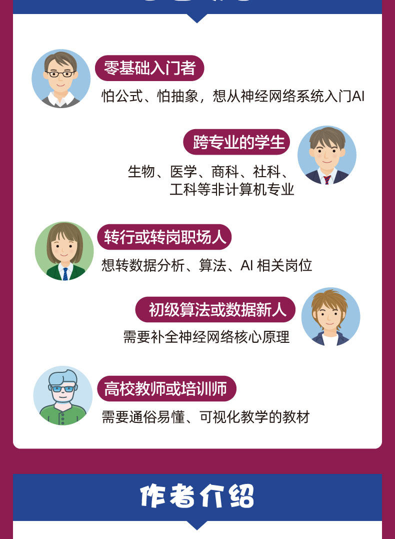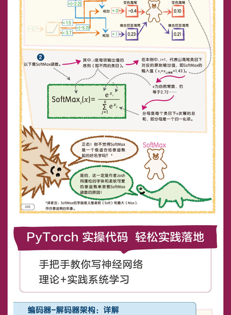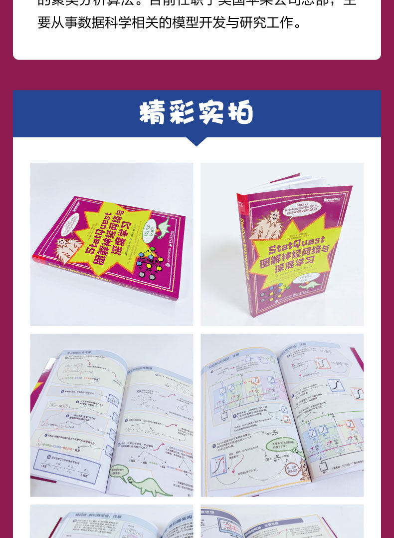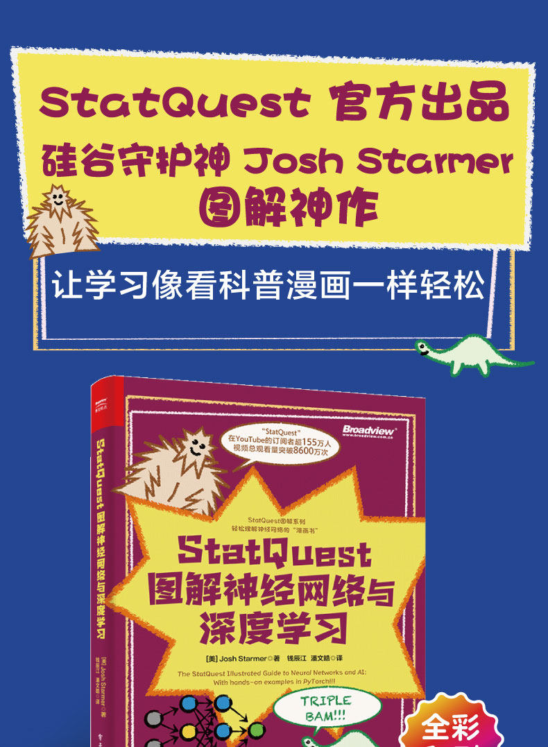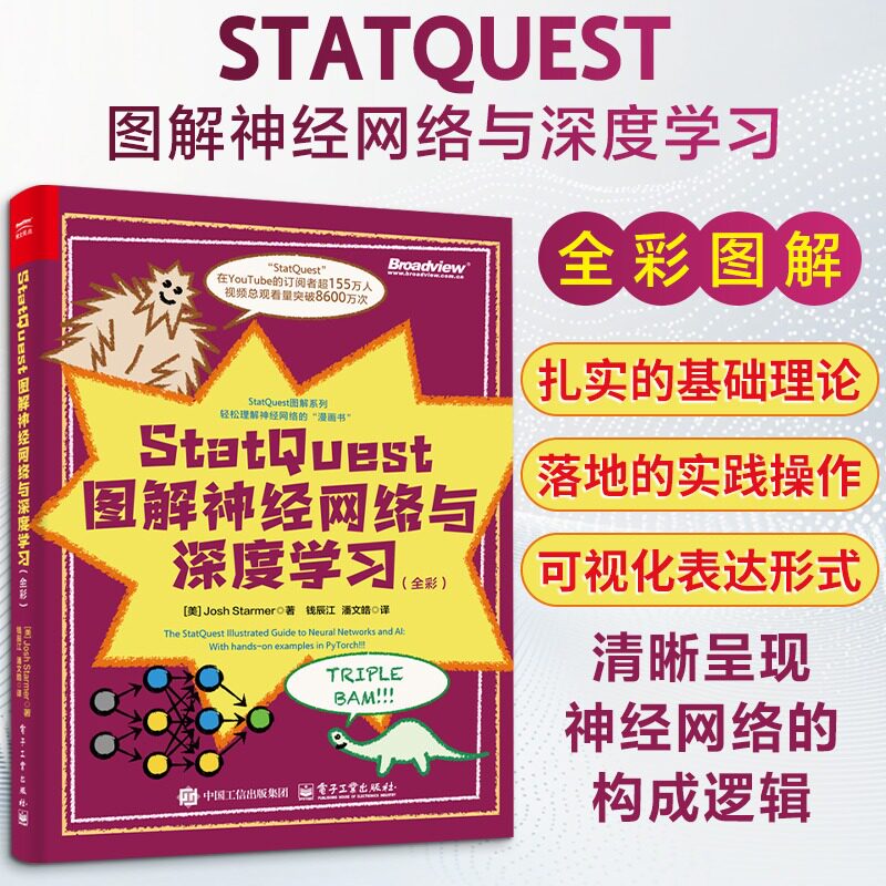 本書是大眾的神經網路與深度學習科普讀物,延續了Josh Starmer 博士暢銷書《StatQuest 圖解機器學的視覺化表達形式與幽默語言風格。書中並未簡化核心概念,而是將複雜的AI技術拆解為一個個演算法小片段,過串聯這些片段,清晰呈現神經網路的構成邏輯,以及 AI技術的誕生原理,引導讀者更深入、更透徹地理解神經洛與深度學習的本質。同時,本書著重理論與實踐的結合,為每個核心概念配套PyTorch實操教程,手把手教者從零開始編寫神經網路程式碼。全書兼顧紮實的基礎理論與落地的實踐操作,內容上從統計基礎知識逐步延伸至神網絡核心原理,搭配完整的 PyTorch代碼,非常適合 AI 技術入門者係統學習。