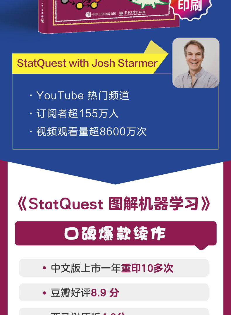 他獨特的圖文表達形式和幽默的語言風格深受觀眾喜愛。這本《StatQuest圖解機器學習》結合了他創新的視覺呈現方式,深入淺出地闡釋了機器學習的基礎知識和高階知識,是一本輕鬆理解機器學習的「漫畫書」。是我們都愛的StatQuest統計學和機器學習書。