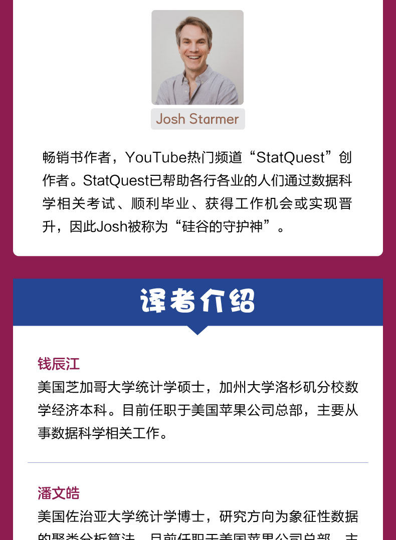 Josh Starmer,YouTube熱門頻道「StatQuest with Josh Starmer」的幕後創作者。他以創新的視覺呈現方式和獨特的教學風格,向全世界好奇的人們解釋了統計學、資料科學和機器學習的概念和演算法。 StatQuest幫助全世界各行各業的人贏得數據科學競賽、通過考試、順利畢業、成功求職或實現晉升,因此,Josh被大家譽為“矽谷的守護神”;他也被譽為“統計學的比爾·奈”,因為他以趣味橫生的方式使機器學習這一話題變得引人入勝;還有人讚譽他為“數據的鮑勃·羅斯”,因為他拒絕通過幽默歌曲的炒作。