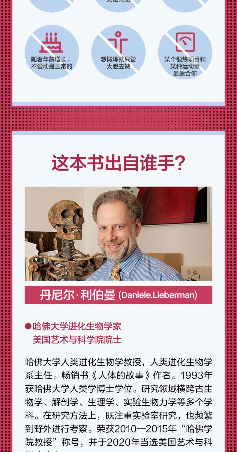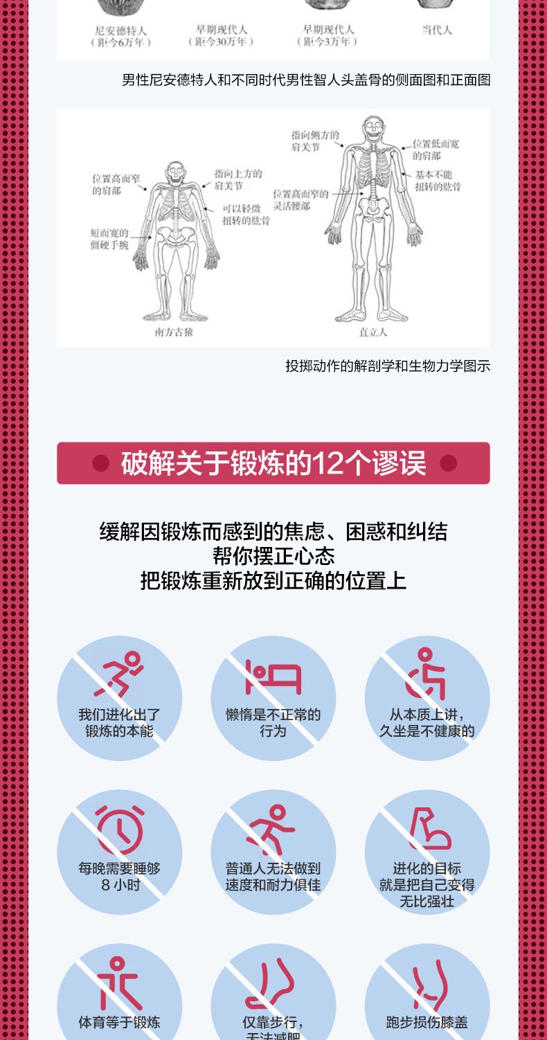 在這本打破神話的書中,利伯曼告訴我們,鍛煉,並不是人類的本能。利伯曼從人類學和進化學的角度探討了我們的身體,破解了關於鍛煉的12個謬誤,教我們可以正確地對待自己的身體並進行正確的身體活動,幫助那些對鍛煉感到焦慮、困惑和糾結的人們把鍛煉重新放到正確的位置上。