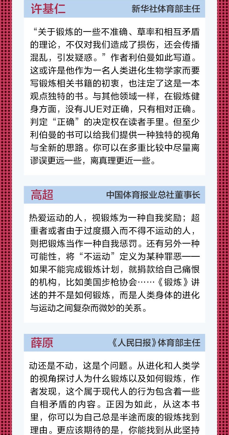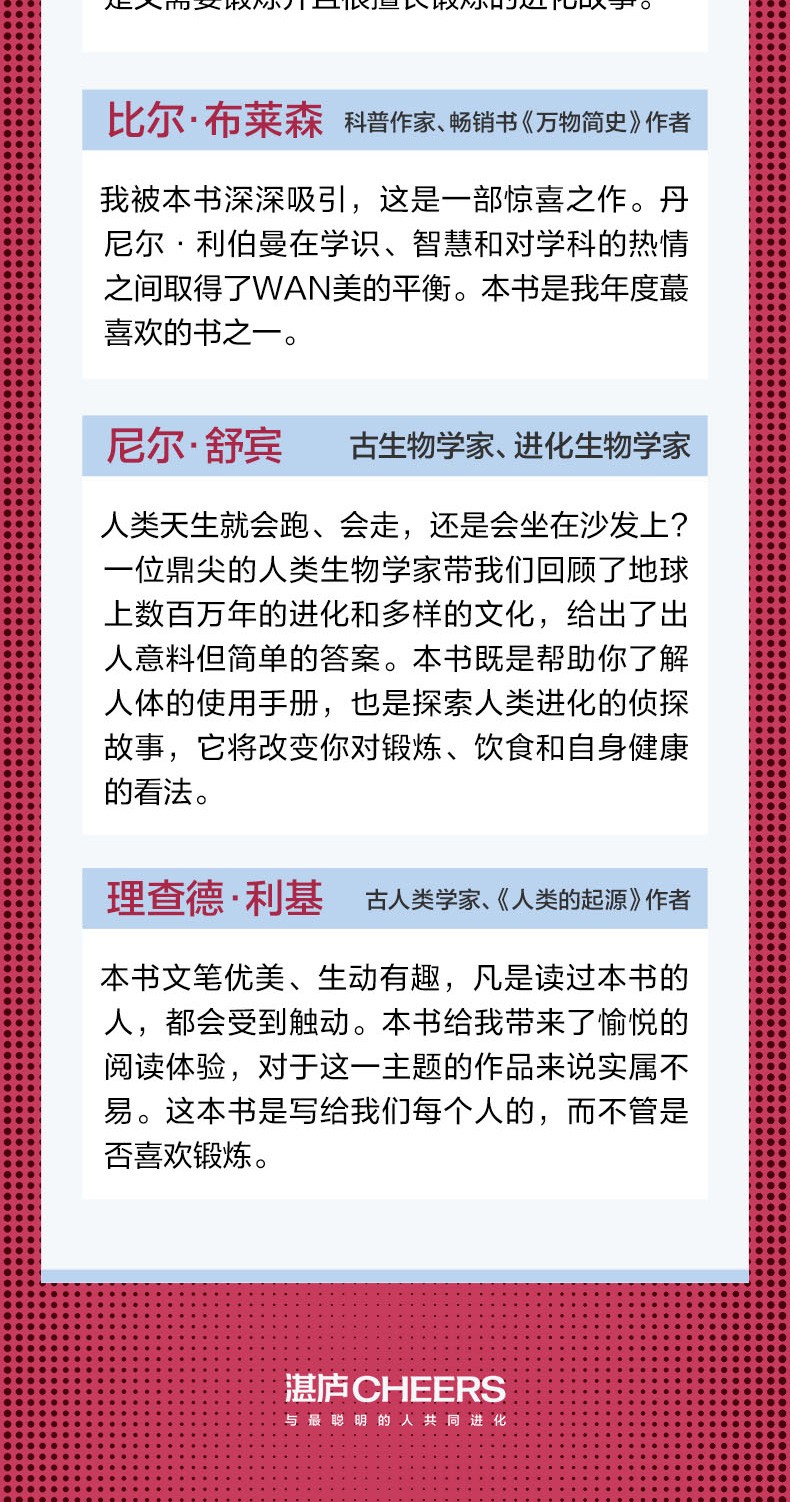 中國體育報業總社GAO級記者譚傑傾情翻譯。新華社體育部主任許基仁,中國體育報業總社董事長高超,CBA公司首XI顧問蔣健,《人民日報》體育部主任薛原,中YANG電視台主持人張斌,醫學博士、心血管醫生鐘幼民,科普作家比爾·布萊森,古人類學家理查德·利基,古生物學家尼爾·舒賓,生物考古學家愛麗絲·羅伯茨等聯袂推薦。