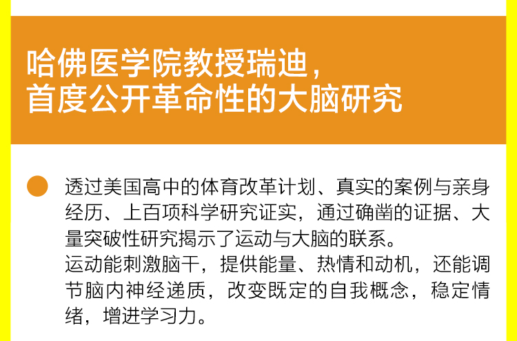 風靡Q球的暢銷讀物。網站書榜、引爆《紐約時報》暢銷榜單,重印C過16次、被譯為10種語言風靡Q球的革命性讀物,19000名中學生驗證的運動奇蹟,Q球12個國家和地區正在流行,令120000人受益的生活新方式