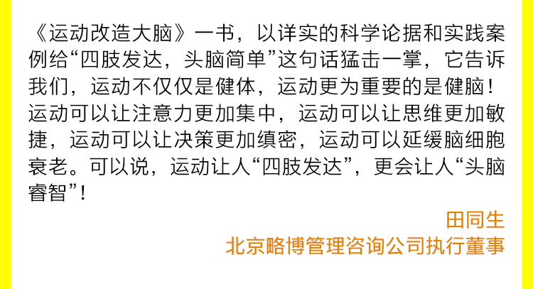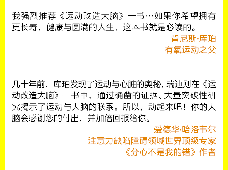 幾十年前,庫珀發現了運動與心臟的奧秘,瑞迪則在《運動改造大腦》一書中,通過確鑿的證據、大量突破性研究揭示了運動與大腦的聯繫。所以,動起來吧!你的大腦會感謝您的付出,並加倍回報給你。