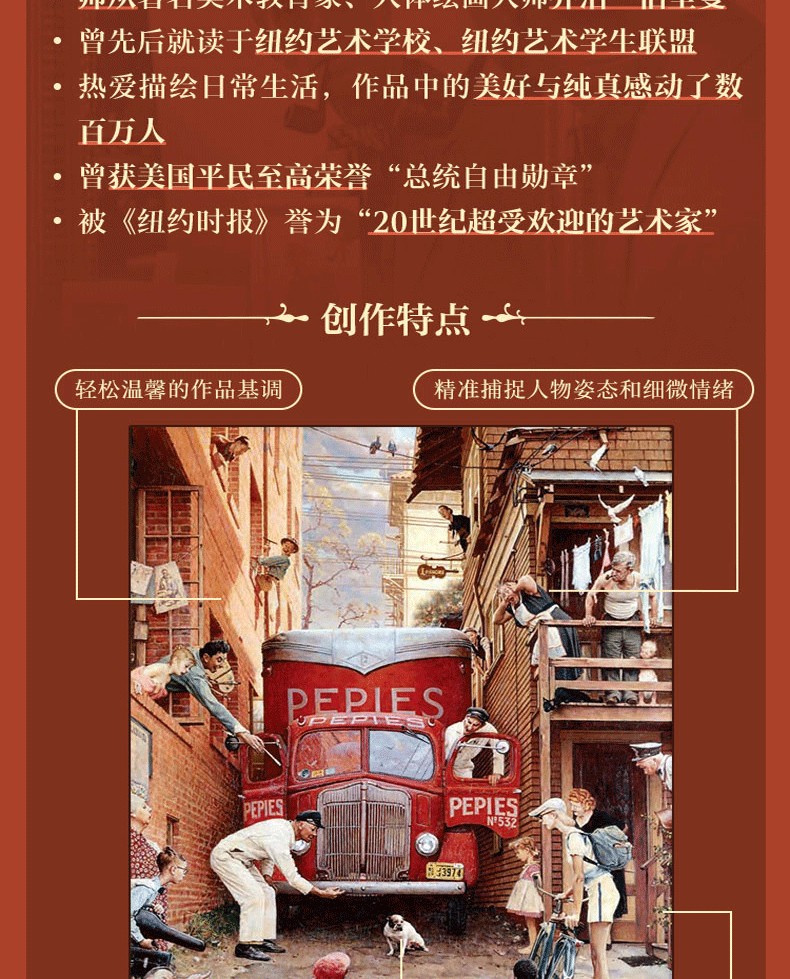 諾曼·洛克威爾(1894—1978),美國傳奇插畫大師,師從·伯里曼,因生動描繪國家風土人物獲美國平民最高榮譽“總統自由勛章”,被《紐約時報》譽為“20世紀美國最受歡迎的藝術家”。洛克威爾也深受邁克爾·傑克遜、史蒂文·斯皮爾伯格、喬治·盧卡斯等藝術家喜愛,對他們的藝術創作產生了深遠影響。