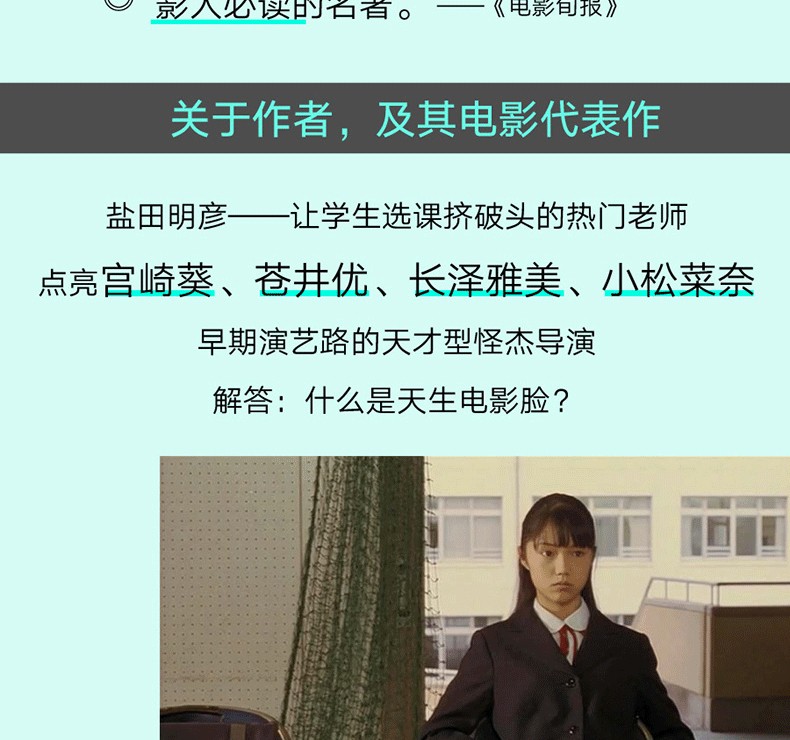 日本導演鹽田明彥,是“立教一派”的代表人物之一,作品曾多次入選《電影旬報》年度十佳,職業生涯中曾挖掘、合作過宮崎葵、蒼井優、長澤雅美、柴崎幸、竹內結子、小松菜奈等諸多女星,她們在鹽田的電影中都發揮出了別樣的魅力。這樣一位挑臉、拍臉眼光極準的導演有著怎樣的“看臉”說·作者漫遊影史細數“顏控”大師,亦結合自身創作經驗進行論述,從希區柯克對臉的物化迷戀,到布萊鬆的視線調度,再到小津安二郎讓臉抽離表情……電影以演員的面部作為舞台,挑選、塑造一張有故事的臉,正是在大銀幕上吸引觀眾目光的強有力手段。