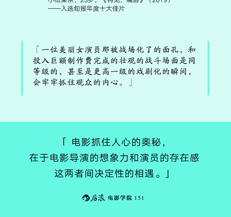鹽田老師精選了歐美中日多部經典影片的華彩段落,截取名作名場面的靜幀畫面,用類似拉片的方式,從演員的臉、視線和表情、動線和動作安排等方面進行評述,讀取導演的調度意圖,破解場景背後人物關係、情感邏輯的“暗碼”,將導演和演員之間互相依賴、彼此成就的關係一一道來,進而揭開影史杰作抓住人心的奧妙所在。