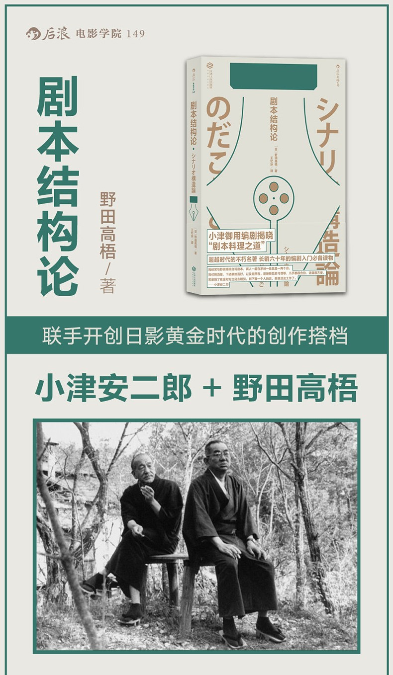 野田高梧飽覽大量經典歐美電影,也從同時代的黑澤明、川端康成、夏目漱石、谷崎潤一郎等名家處採擷靈感,將他們的創作經驗吸納到劇本這一“年輕”的形式中。他從蒙太奇手法聯想到歌舞伎的雙花道舞台,用亞里士多德《詩學》中的戲劇結構對比能劇中的“序破急”法則,從契訶夫的《備忘錄》談到夏目漱石的“味噌本”……《劇本結構論》可謂是一卷凝聚了野田高梧畢生所學的“武功秘籍”。