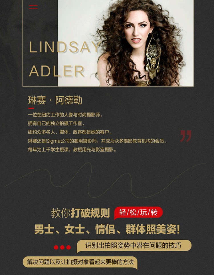 本書作者琳賽·阿德勒是一位屢獲殊榮的攝影師和暢銷書作家。對於想要深入了解成功擺姿技巧的人而言,這本書將會是一個很棒的選擇,它將會成為你拍攝和擺姿的快速參考指南。