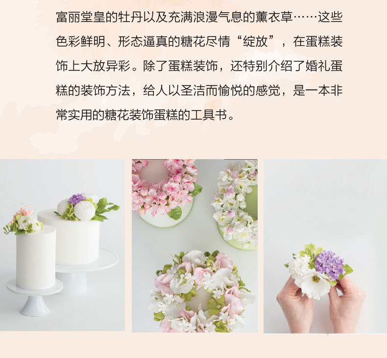 糖花作為翻糖的一個門類,以其逼真、美觀的表現形態,成為蛋糕裝飾推薦的方法與技巧。本書中花型豐滿、顏色各異的繡球花,花姿豐盈、端莊高雅的山茶花,雅緻清新、自由快樂的波斯菊,玉笑珠香、富麗堂皇的牡丹以及充滿浪漫氣息的薰衣草……這些色彩鮮明、形態逼真的糖花盡情“綻放”,在蛋糕裝飾上大放異彩。除了蛋糕裝飾,還特別介紹了婚禮蛋糕的裝飾方法,給人以聖潔而愉悅的感覺,是一本非常實用的糖花裝飾蛋糕的工具書。
