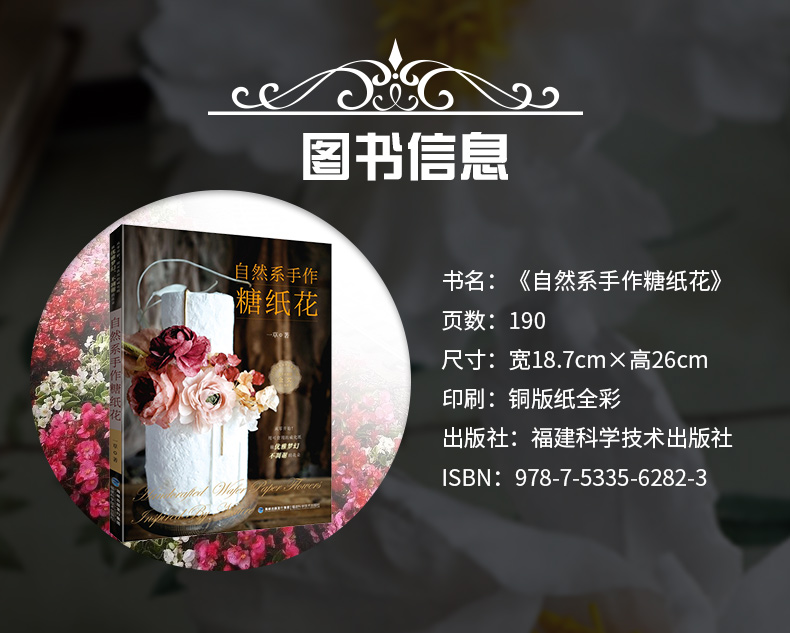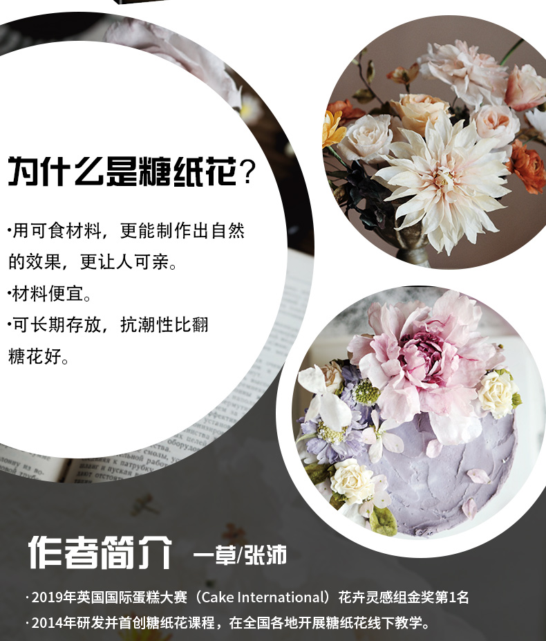 糖紙花是使用可食用材料威化紙製作的“不凋謝”的花朵。材料便宜,可以長時間存放,抗潮性比翻糖花卉好,可以放在蛋糕上裝飾,提升蛋糕的美感和價值。 ◆國內第一本糖紙花專書,國際蛋糕大賽花卉靈感組金獎及第1名得主一草老師,帶你領略糖紙花的優雅、夢幻。 ◆從零開始教,圖文+小視頻,細緻示範染色、塑形、組裝等製作全程,邊看邊學,即使是初學者也能做出自然擬真的花朵。 ◆不僅僅是做糖紙花,還有糖紙花在婚禮蛋糕甜品台、點心盒、花環等場景的實際應用,給你一些啟發和助力,一點點實現生活裡的小小藝術......